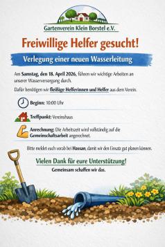 für Samstag, den 18.04.2026, suchen wir noch freiwillige Helfer, die bei Arbeiten an der Wasserversorgung helfen.